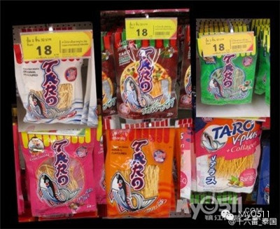 在泰国,也有一款家喻户晓的鳕鱼香丝,那就是TARO!不管你去各大商场、7-11、杂货店等,都一定会发现它的踪迹,而且还不只出一种口味而已喔,有原味、辣味、BBQ、韩式烧肉、泰式沙拉等等,完全把泰国人爱丰富口味的精神发挥到极致。中包装的TARO一包售价约18-20泰币。
