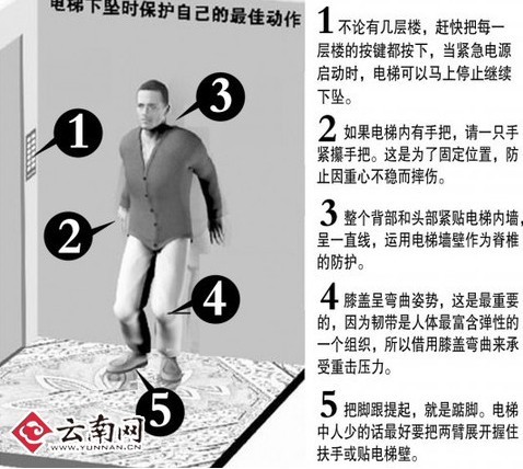 所以:第一点是当紧急电源启动时,电梯可以马上停止继续下坠。第二点是为了要固定你人所在的位子,以致于你不会因为重心不稳而摔伤。第三点是为了要运用电梯墙壁作为脊椎的防护。第四点是最重要的是因为韧带是唯一人体富含弹性的一个组织,所以借用膝盖弯曲来承受重击压力,比骨头来承受压力来的大。一个医师强调, 如果每个收到这份邮件的人, 能够转给其他人,没准将来会有一条生命被救!意外无处不在。