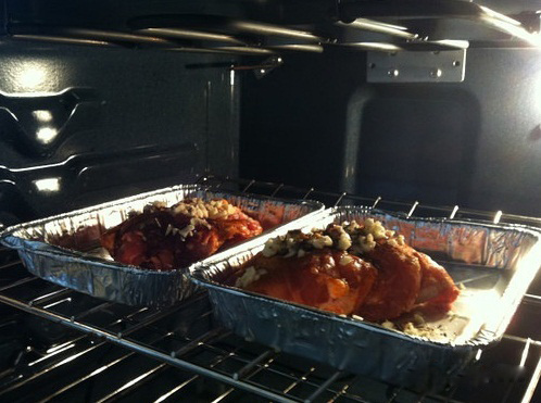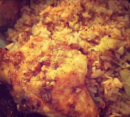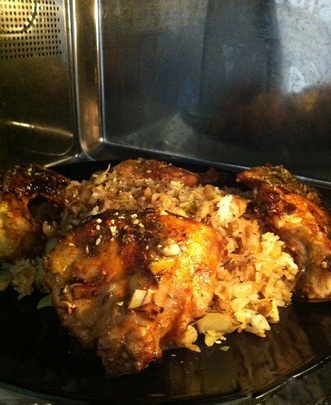 4.最后把烤好的鸡盖在事先准备好的米饭上,放入微波炉,让多余的鸡油渗进米饭里。