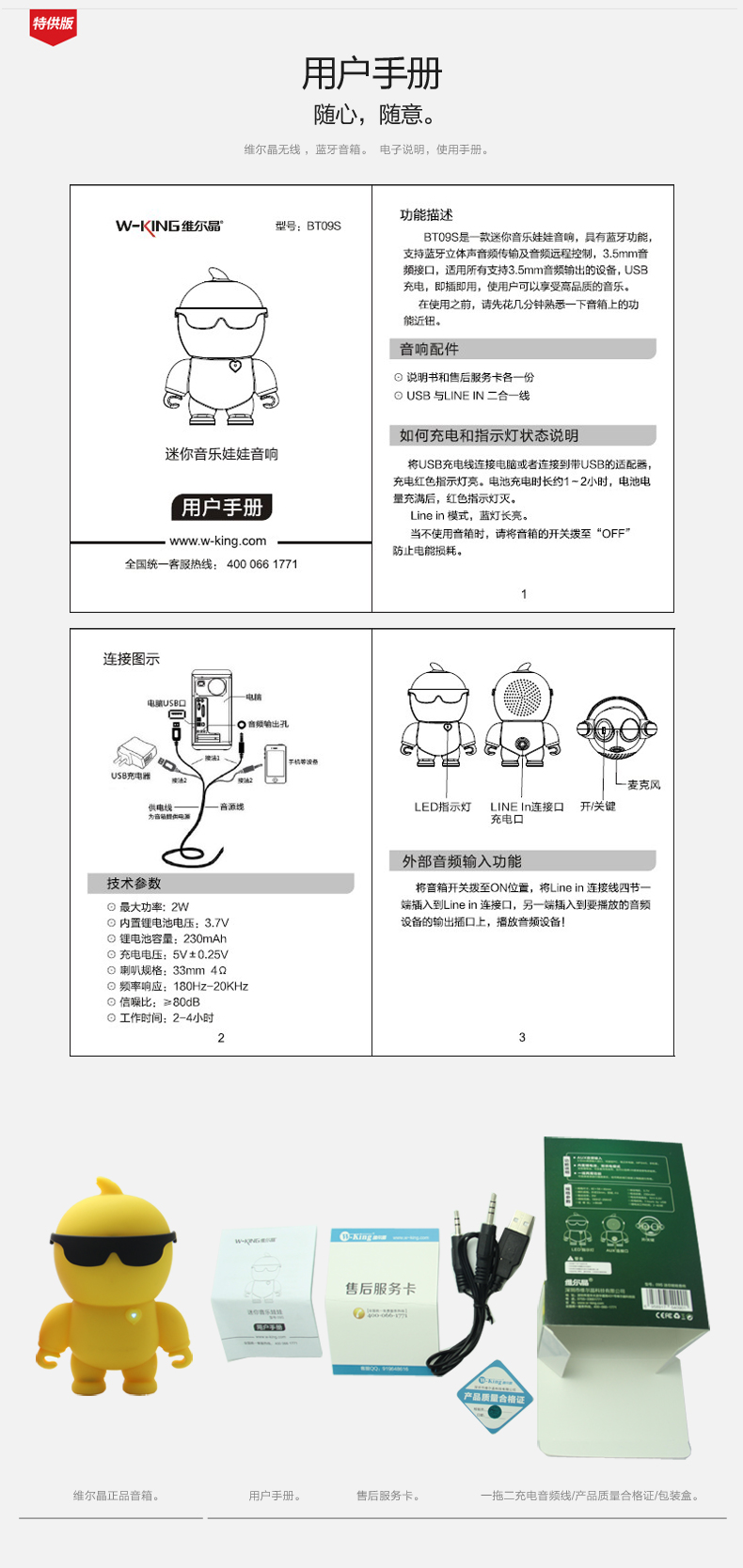 一款迷你音乐娃娃音响,具有篮牙功能,支持篮牙立体声音频传输及音频远程控制,3.5mm音频接口,适用所有支持3.5mm音频输出的设备,USB 充电,即插即用,使用户可以享受高品质的音乐。
