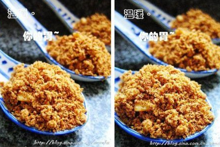 2. 水份越来越少,火也要调的更小,用极小的火耐心的将豆渣和调味品炒匀,直到水分彻底蒸发,豆渣程松散蓬松的肉松状即可关火,待热量散尽后可密封保存,搭配粥类食用。