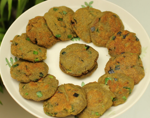 原料:鸡蛋、豆渣、葱花、虾皮、面粉、盐、胡椒粉、芝麻油。