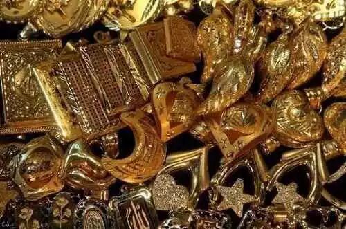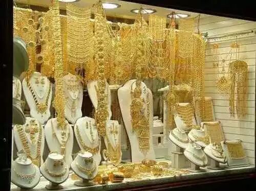 这里黄金饰品不是一件一件,而是一堆一堆摆出来的