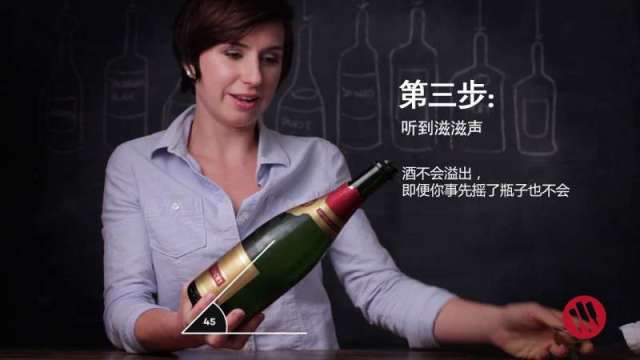 - 软木塞弹出后仍然保持瓶身倾斜45度,停留2秒,这样瓶中的酒就不会随着压力溢出了。