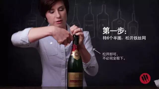将铁丝网套锁口处的铁丝缓缓拧动6个半圈,直到能够通过瓶唇(瓶口凸起的部分)。这个时候软木塞随时都有可能爆出,所以不要取下铁丝网,要用手把铁丝网和软木塞握紧。