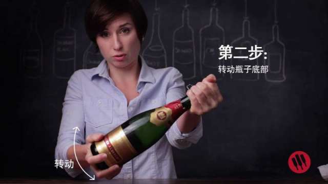 让瓶身倾斜45度,一手握紧铁丝网和软木塞,同时另一只手转动瓶子底部。这样会比转动软木塞更容易也更安全。