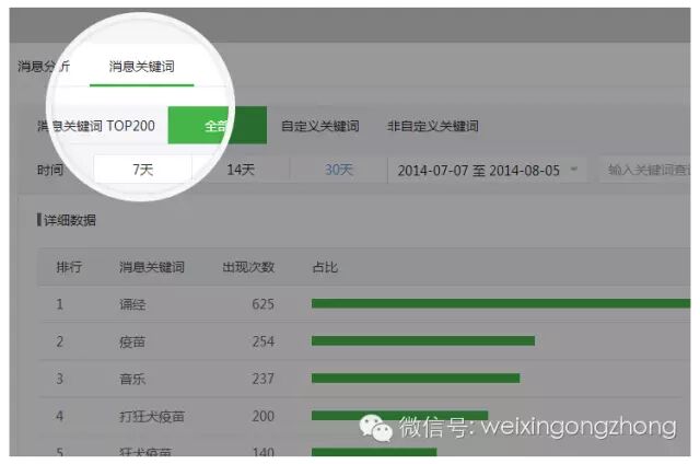 6.增加消息关键词页,可查看用户发给公众号的消息中有哪些关键词,便于公众号了解用户需求
