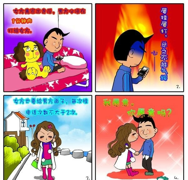 7、吵架时男方不准挂电话,如果挂了要马上打回去,并表示歉意;吵架时女方如果挂了电话,男方必须在1分钟内打给女方。电话不通打手机,总之不能气绥,屡挂屡打,但是女方也要给男方面子,每次挂电话次数不大于2次。