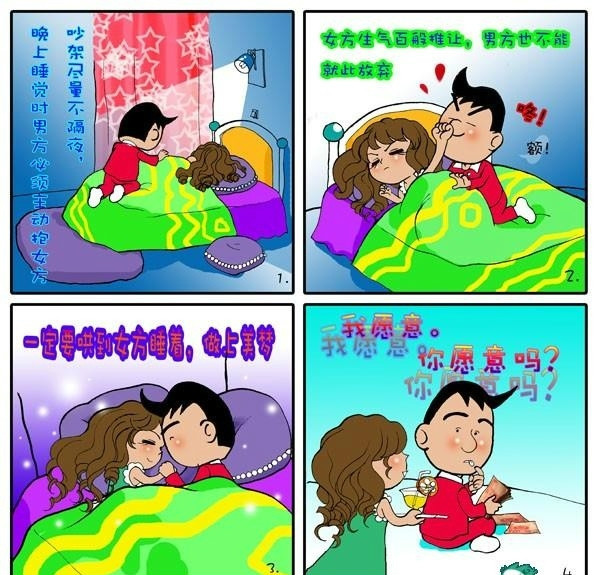 8、吵架尽量不隔夜,晚上睡觉时男方必须主动抱女方,女方生气百般推让男方也不能就此放弃,一定要哄到女方睡着,做上美梦……