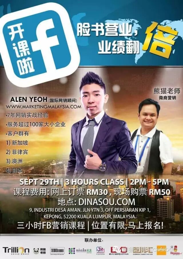 3小时FB微营销课+2 闪电开课 29/9/16 发表于26/09/201626/09/2016 作者 Nick Albert 熊猫老师 【让你学到会而不另收费】 微商们,企业家们,在家创业的朋友们,一起来出席一场3个小时的FB营销课程,让90后的可爱帅哥教你打遍FB无敌手。 吉隆坡 9月29号 2pm~5pm 包你学会,一起迈向互联网大咖之路。 找我报名吧!一个人RM30罢了。 Nick Albert 0123473825 别告诉我你没时间,那我只好叫老师来你家找你,一对一教学了,那就不止是RM30咯! 线上购票 RM30;现场付费购票 RM50! 评分:分享给朋友吧!朋友会谢谢你! 点击分享到 Facebook (在新窗口中打开) Facebook 点击以分享到 X(在新窗口中打开) X 点击分享到 LinkedIn(在新窗口中打开) LinkedIn 点击分享到WhatsApp(在新窗口中打开) WhatsApp 点击分享到Tumblr(在新窗口中打开) Tumblr 更多 点击以打印(在新窗口中打开) 打印 相关